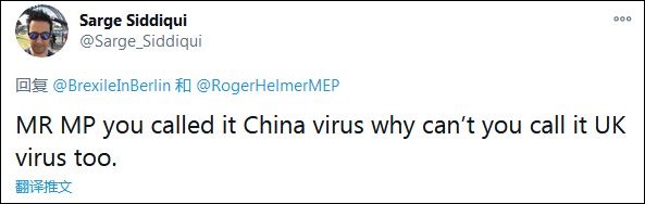 不少網(wǎng)友指出了赫爾默的雙標(biāo)?!白h員先生,你管這(新冠病毒)叫‘中國病毒’,為什么不也把它叫做英國病毒?”