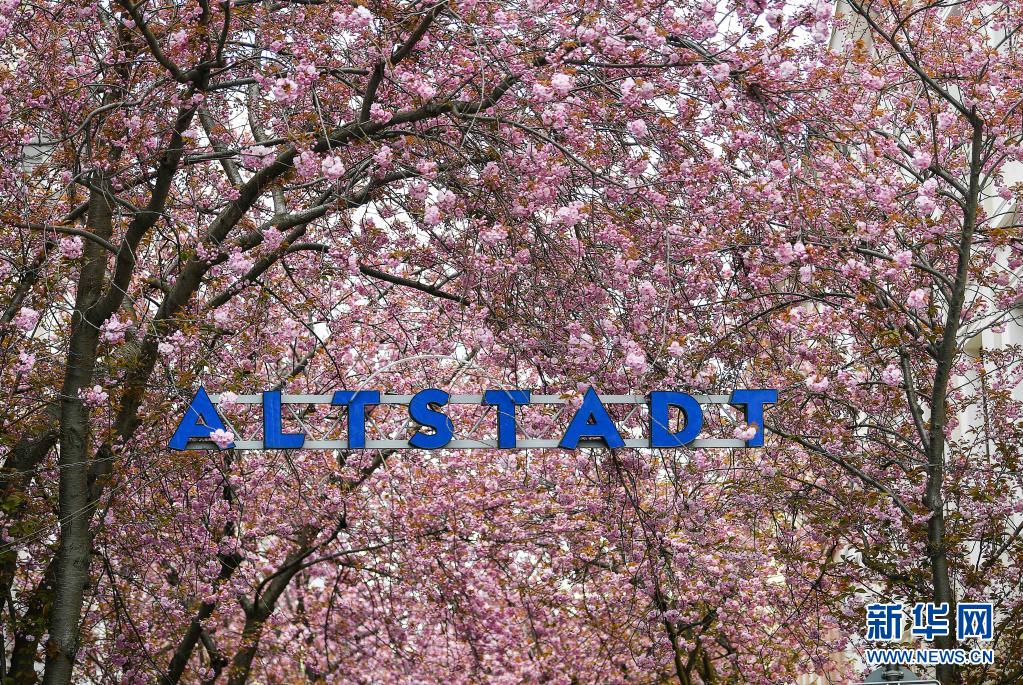 這是4月13日在德國(guó)波恩老城區(qū)拍攝的盛開的櫻花。