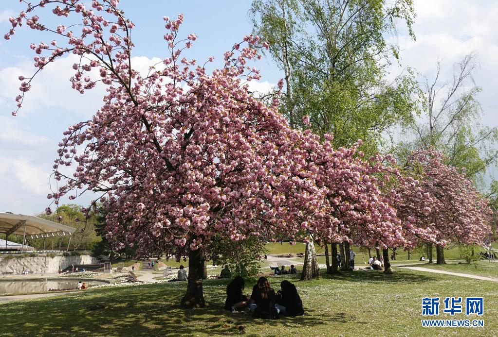 4月21日,人們在法國巴黎一處公園的櫻花樹下休閑。
