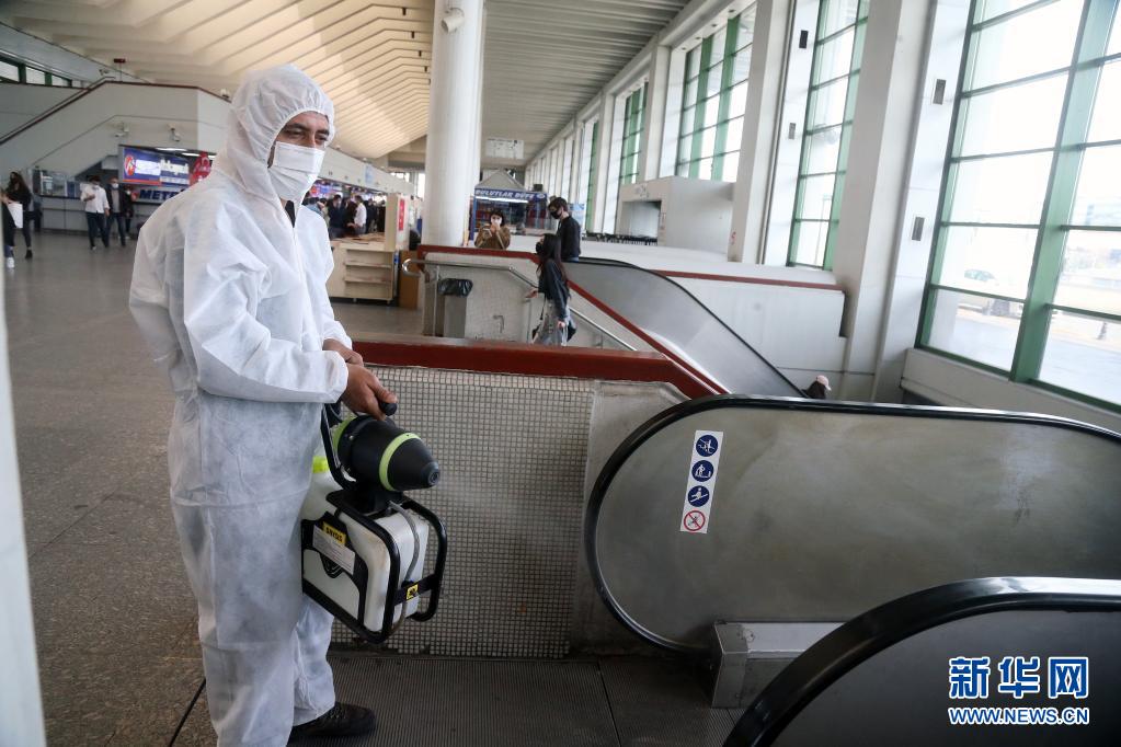 4月29日禁令實施前,一名身穿防護(hù)服的清潔工人在土耳其安卡拉的公共汽車站消毒。