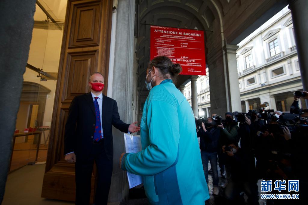 5月4日,在意大利佛羅倫薩,烏菲齊美術(shù)館館長施密特(左)在重新開放的美術(shù)館門口迎接參觀者。當日,意大利烏菲齊美術(shù)館重新開放。美術(shù)館改建了售票處和接待處,以避免排隊,并開設(shè)了十四個新展室。新華社發(fā)