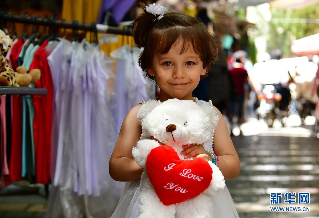 5月11日,一名女孩在敘利亞首都大馬士革的市場上抱著剛剛買到的玩偶。