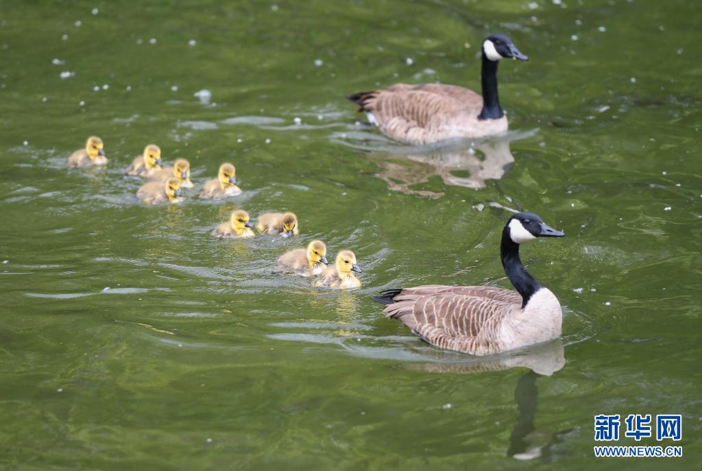 這是5月19日在德國(guó)法蘭克福的美茵河拍攝的加拿大雁。