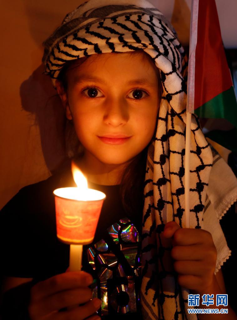 5月20日,一名兒童在約旦河西岸城市納布盧斯參加聲援活動。