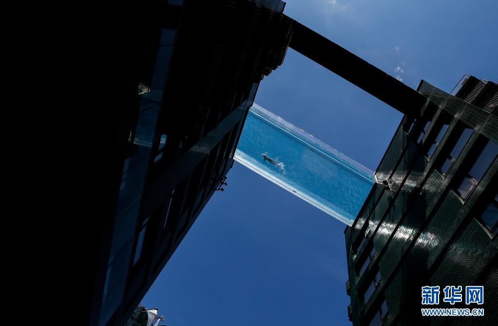 6月2日,一名女子在英國(guó)倫敦南部一個(gè)建造于兩棟公寓樓之間的“空中泳池”游泳。