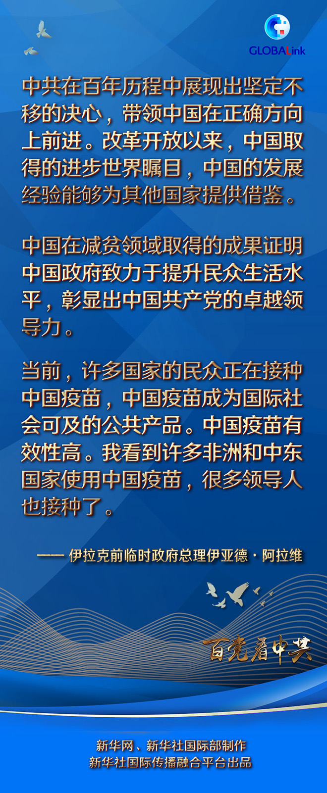 阿拉維對中國共產(chǎn)黨百年華誕表示祝賀。他說,中共在百年歷程中展現(xiàn)出堅定不移的決心,帶領(lǐng)中國在正確方向上前進。改革開放以來,中國取得的進步世界矚目,中國的發(fā)展經(jīng)驗?zāi)軌驗槠渌麌姨峁┙梃b。