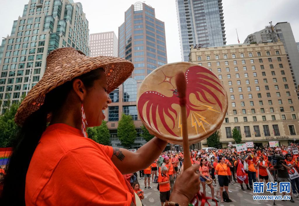 當天是加拿大日,上千名抗議者在溫哥華集會,悼念加拿大在強制“同化”原住民過程中遭到殘害的兒童,呼吁取消加拿大日的慶?;顒印?/p>