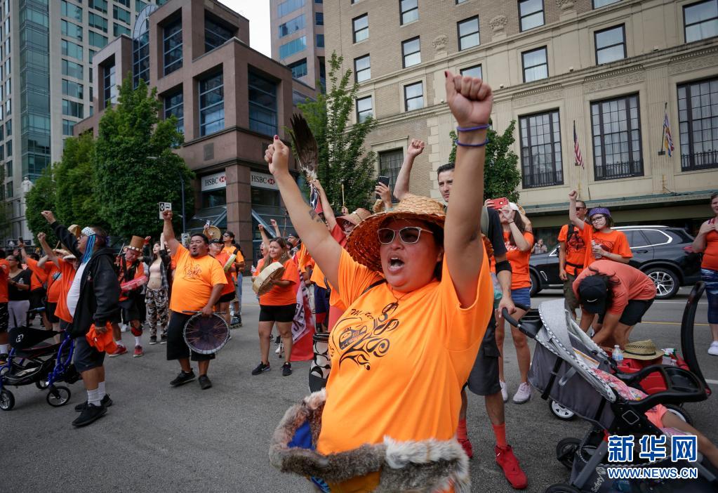 當天是加拿大日,上千名抗議者在溫哥華集會,悼念加拿大在強制“同化”原住民過程中遭到殘害的兒童,呼吁取消加拿大日的慶?;顒?。
