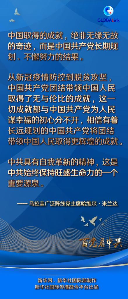 今年是中國共產(chǎn)黨建黨百年,米蘭達(dá)代表烏拉圭廣泛陣線黨表示熱烈祝賀。他表示,中共具有自我革新的精神,這是中共始終保持旺盛生命力的一個重要源泉。
