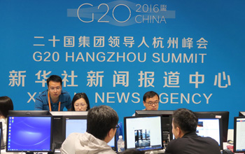 G20峰會(huì)新聞中心內(nèi)專注而忙碌的記者們